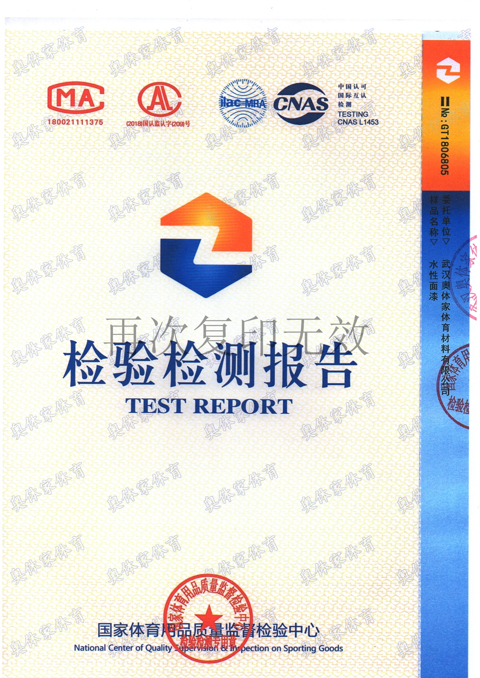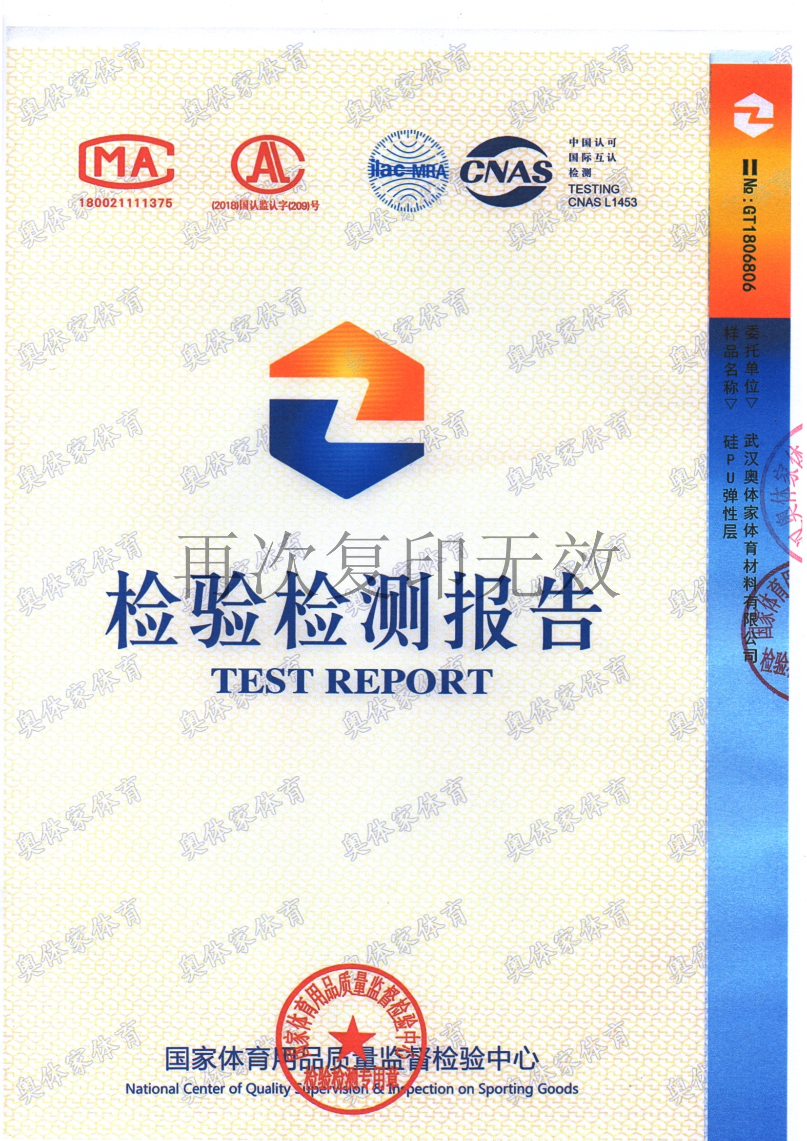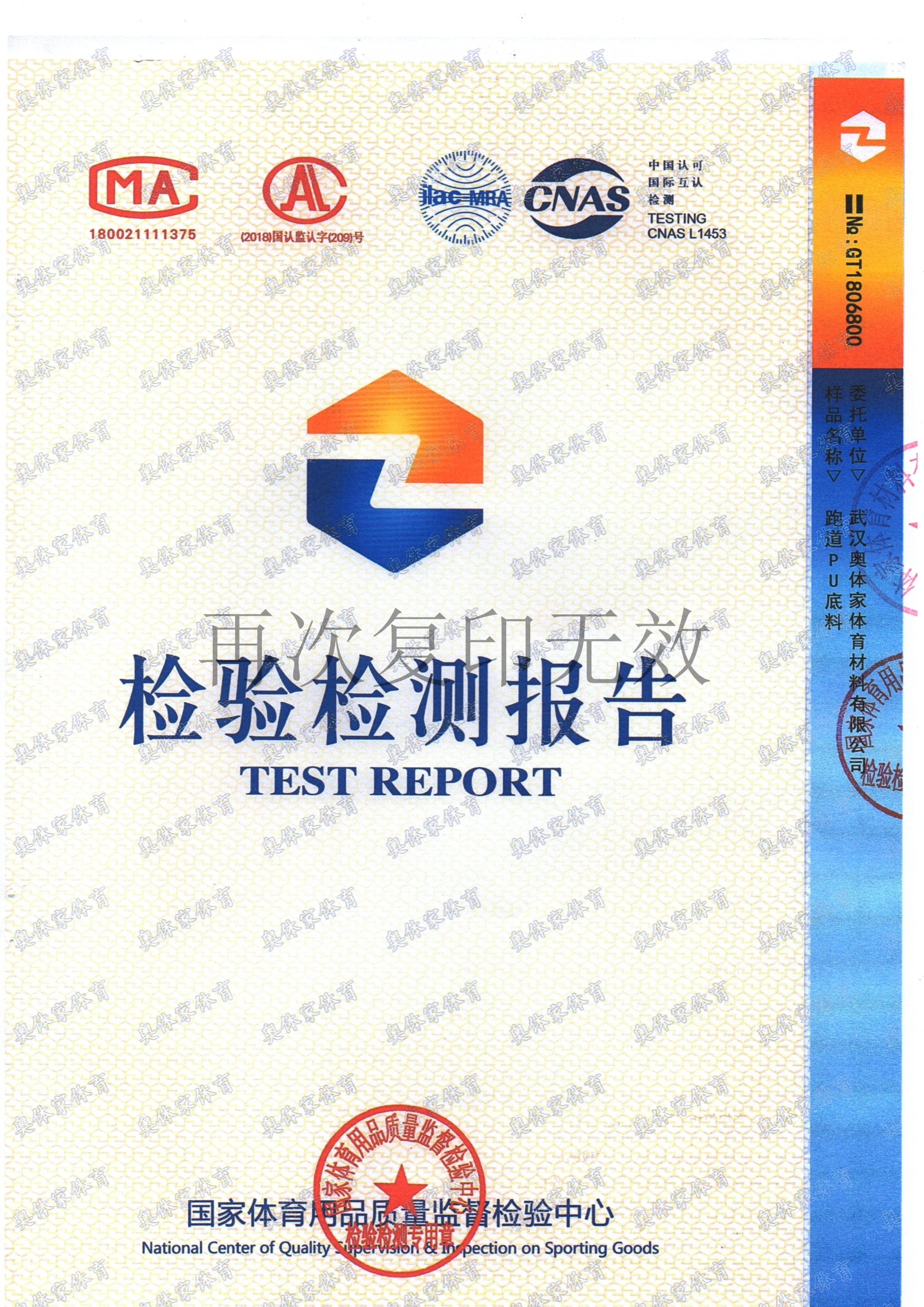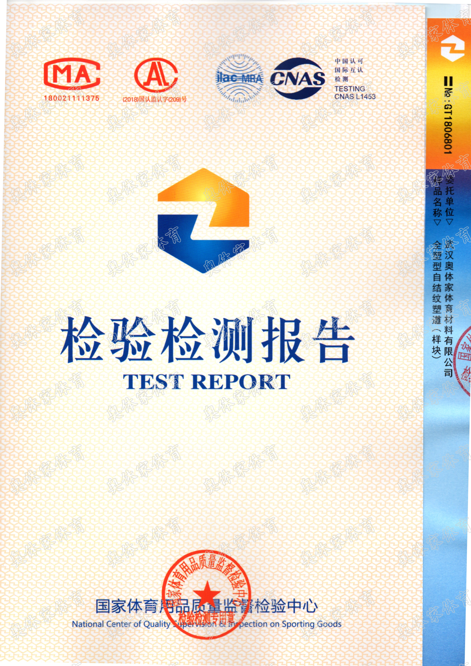 天辰娱乐新国标全塑型自结纹塑胶跑道检测报告